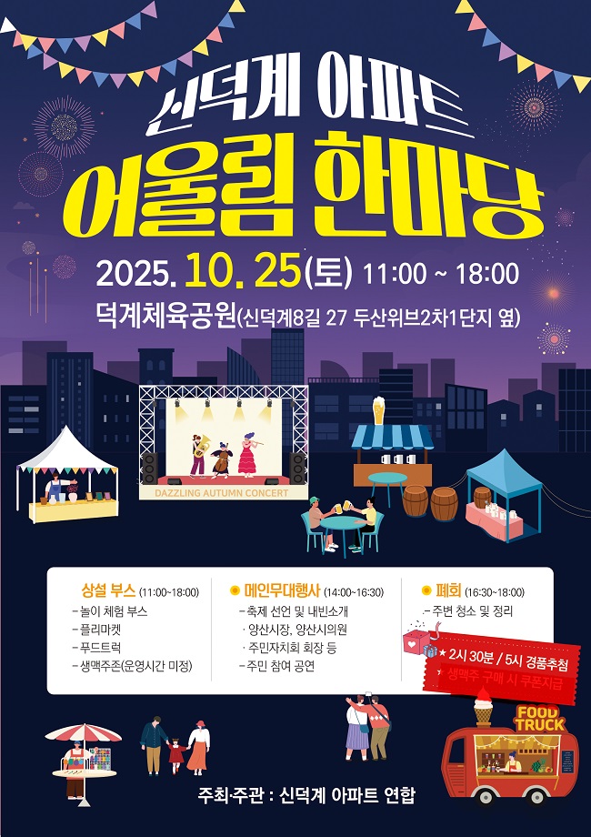 양산 신덕계 아파트 연합, `어울림 한마당 축제` 열린다단지 경계 넘어 지역사회 소통과 화합의 장 마련...대표 마을 축제로 도약 체험 부스, 주민 공연, 플리마켓, 경품 추첨 등 온 가족이 즐길 다채로운 프로그램 최영재 기자 / |